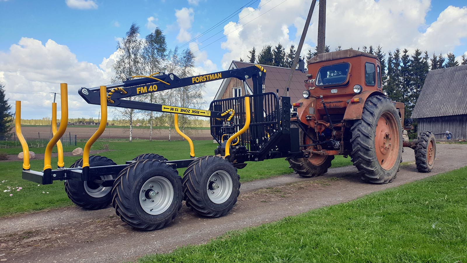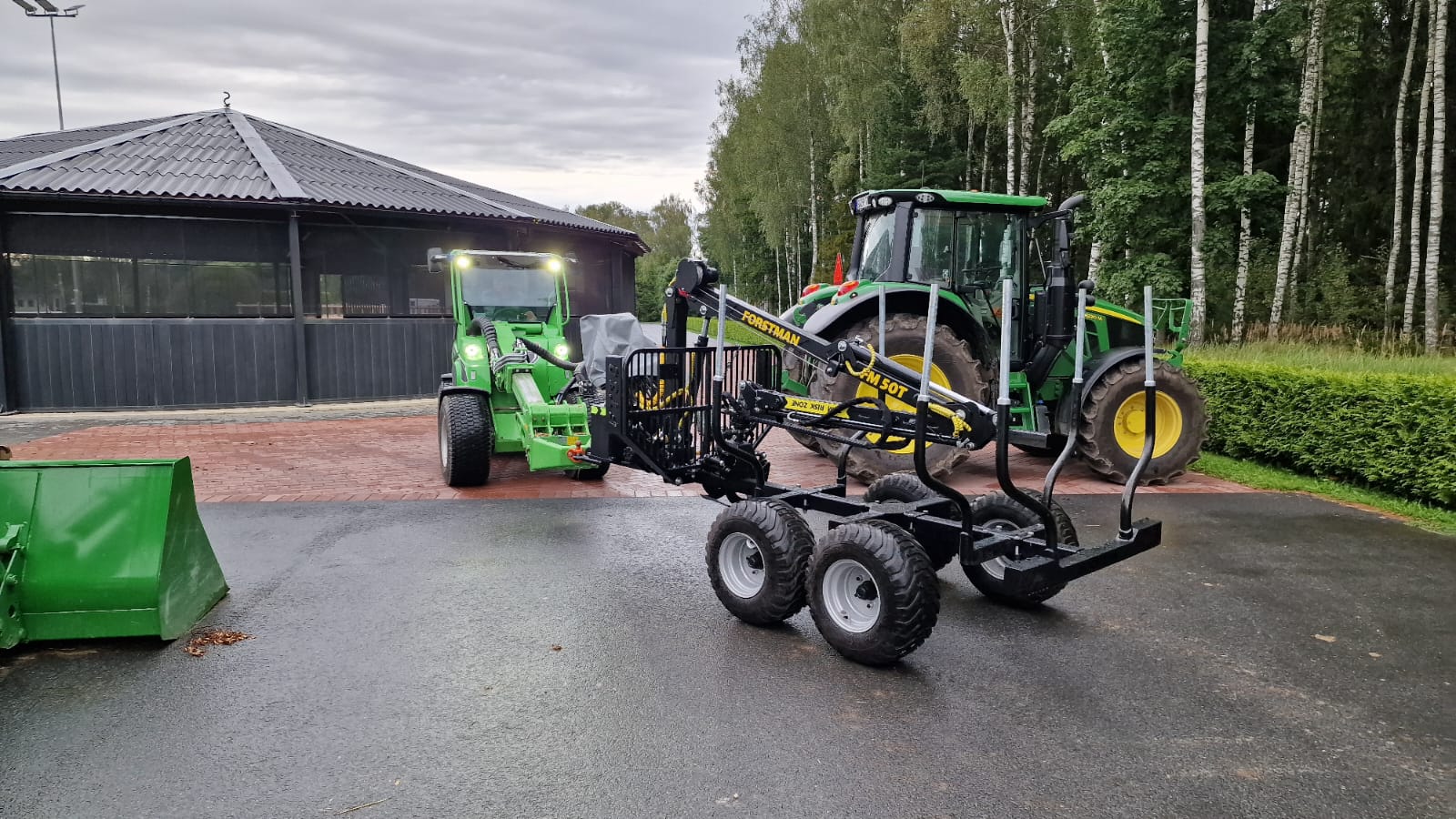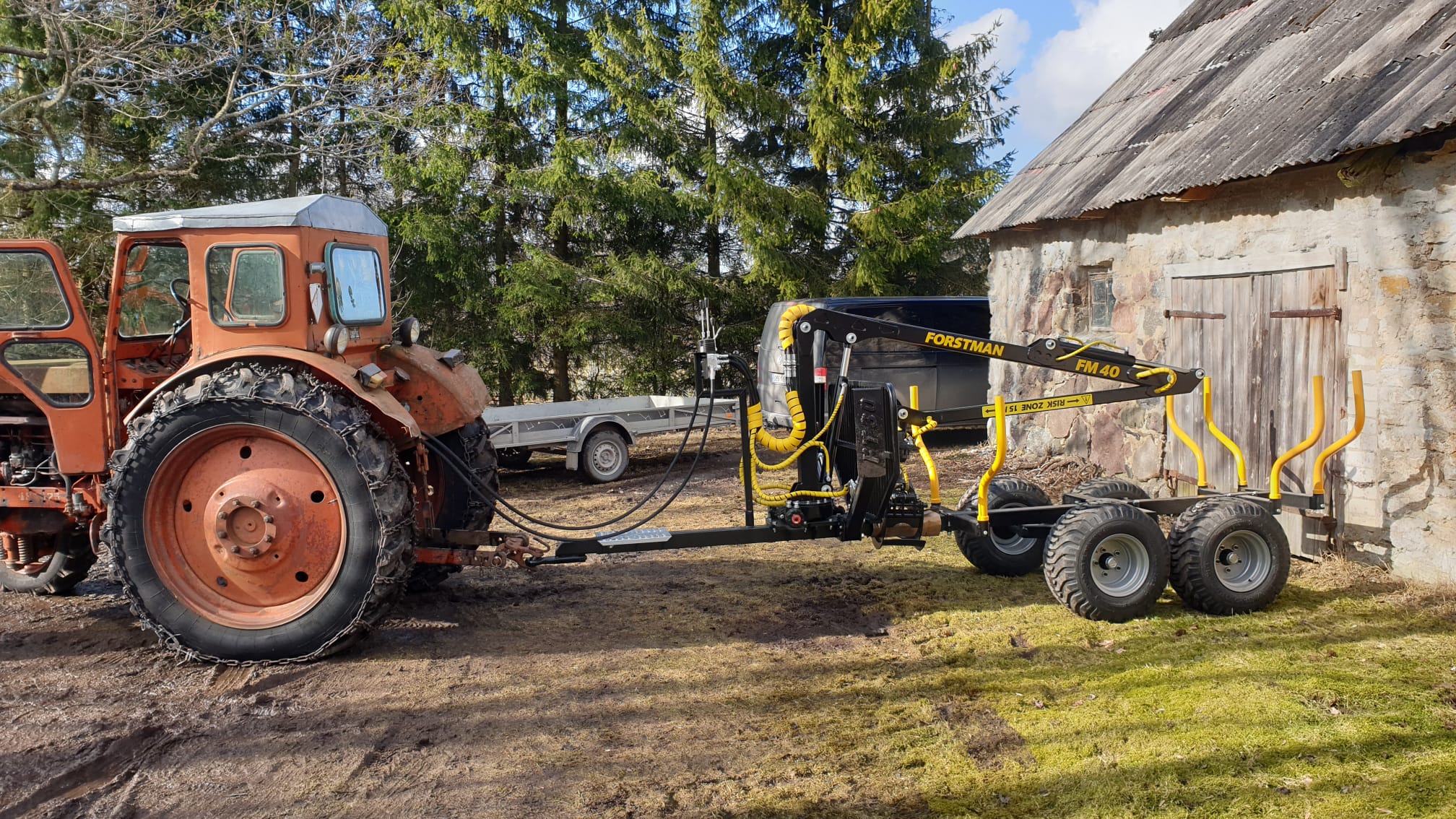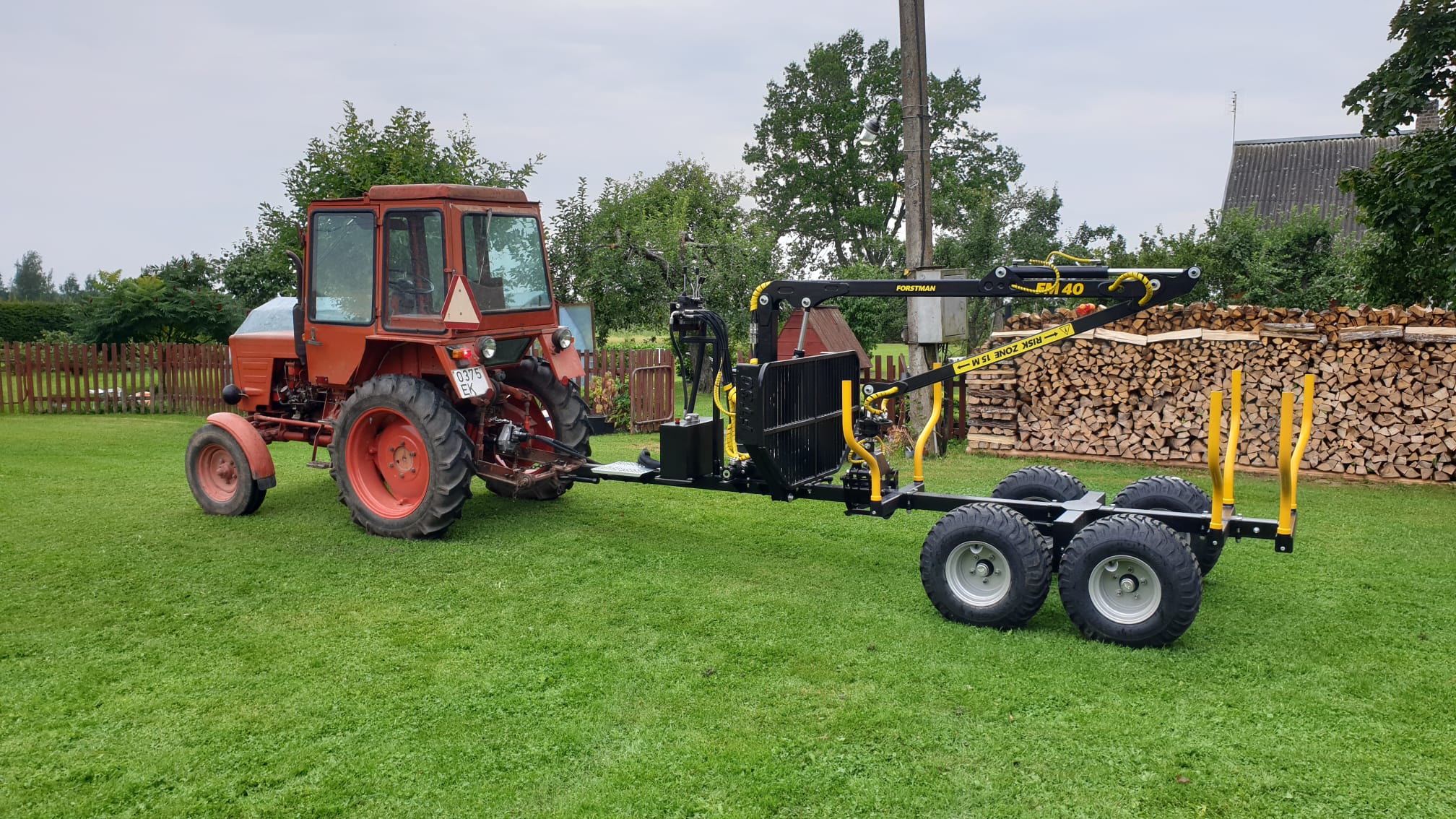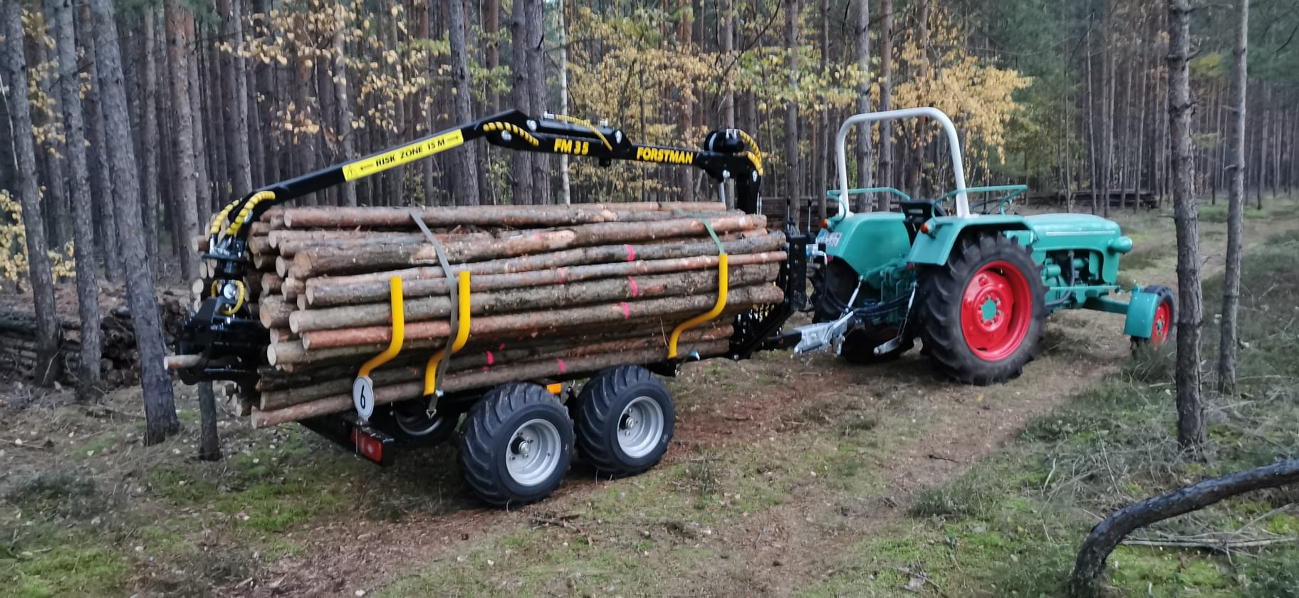 Forest trailers with a load capacity of up to 3.7 tons and forest cranes with a reach of 3.5 to 5.1 meters are designed for small compact tractors with 16–40 hp. Optional equipment includes hydraulic winches, 4-wheel drive systems, hydraulic stations, pumps, and more. We hope you find the perfect solution here.